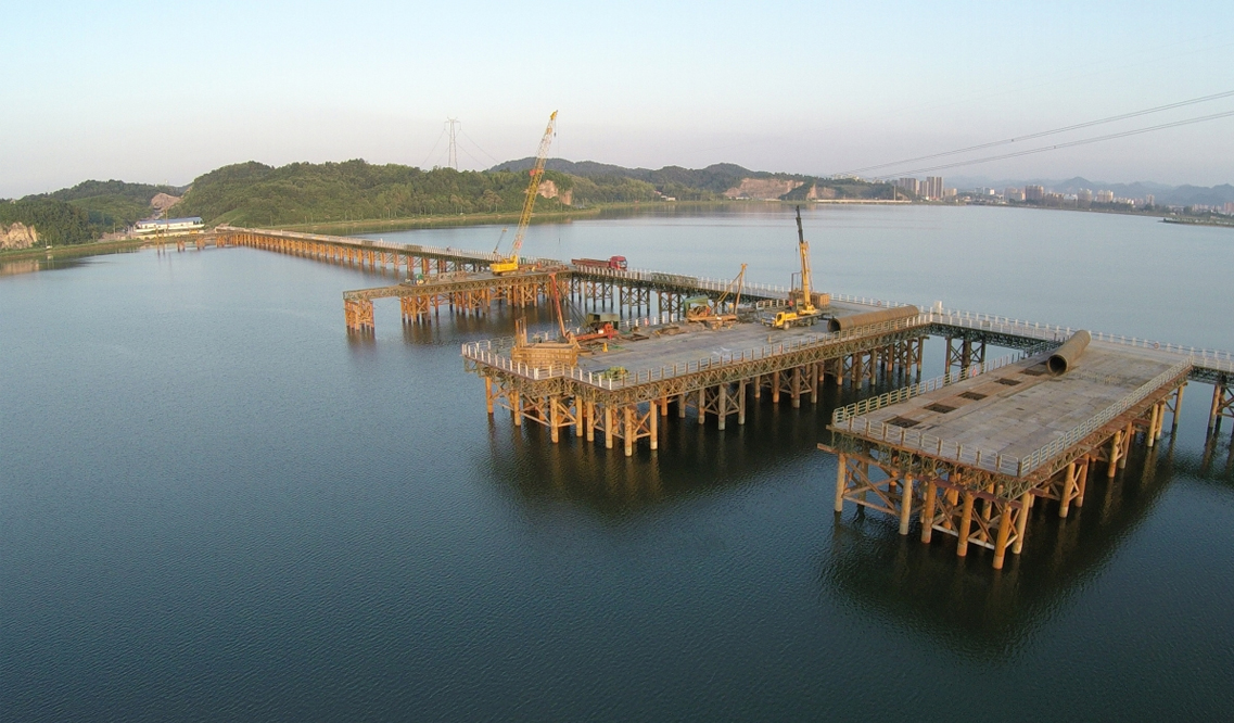 主栈桥宽度8M, 总长度923.5M,计7388M²,施工工期75天。支栈桥及钻孔平台共计14个,长度55,总宽度15M。共计11550M²。