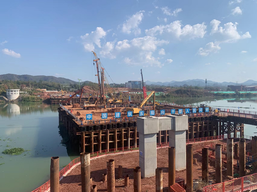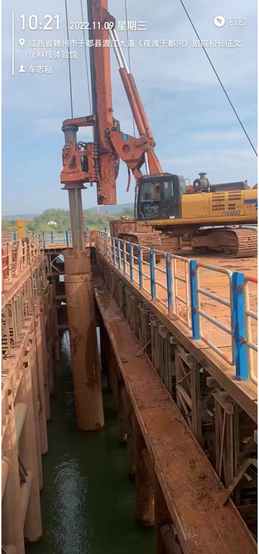 地质层序复杂,相变剧烈及厚度不均且细沙层过厚,围堰施工采取旋挖钻机引孔至设计标高后,回填黄土至 河床标高,回填完成后拔出钢护管,进行第2根桩孔的引孔和换填按此步骤依次进行所有钢管桩基槽的换填。然后用振动锤插打锁扣桩到设计标高。