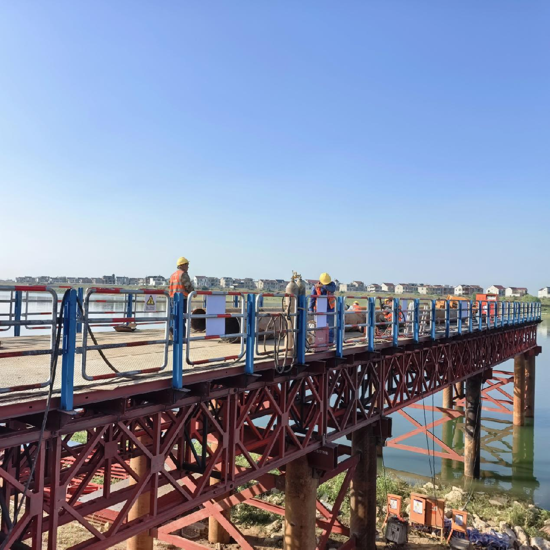 施工栈桥首先施工栈桥桥台,然后采用履带吊“钓鱼法”逐跨推进搭设,期间穿插搭设钢平台。